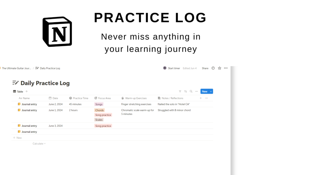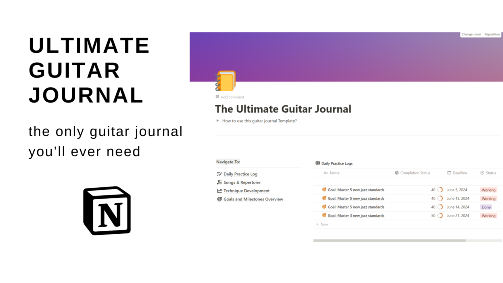 Transform your guitar practice with the StrumMaster Guitar Journal—a meticulously designed digital journal crafted with passion in Notion.